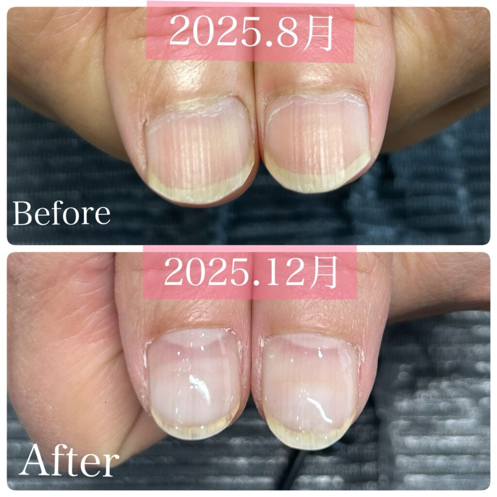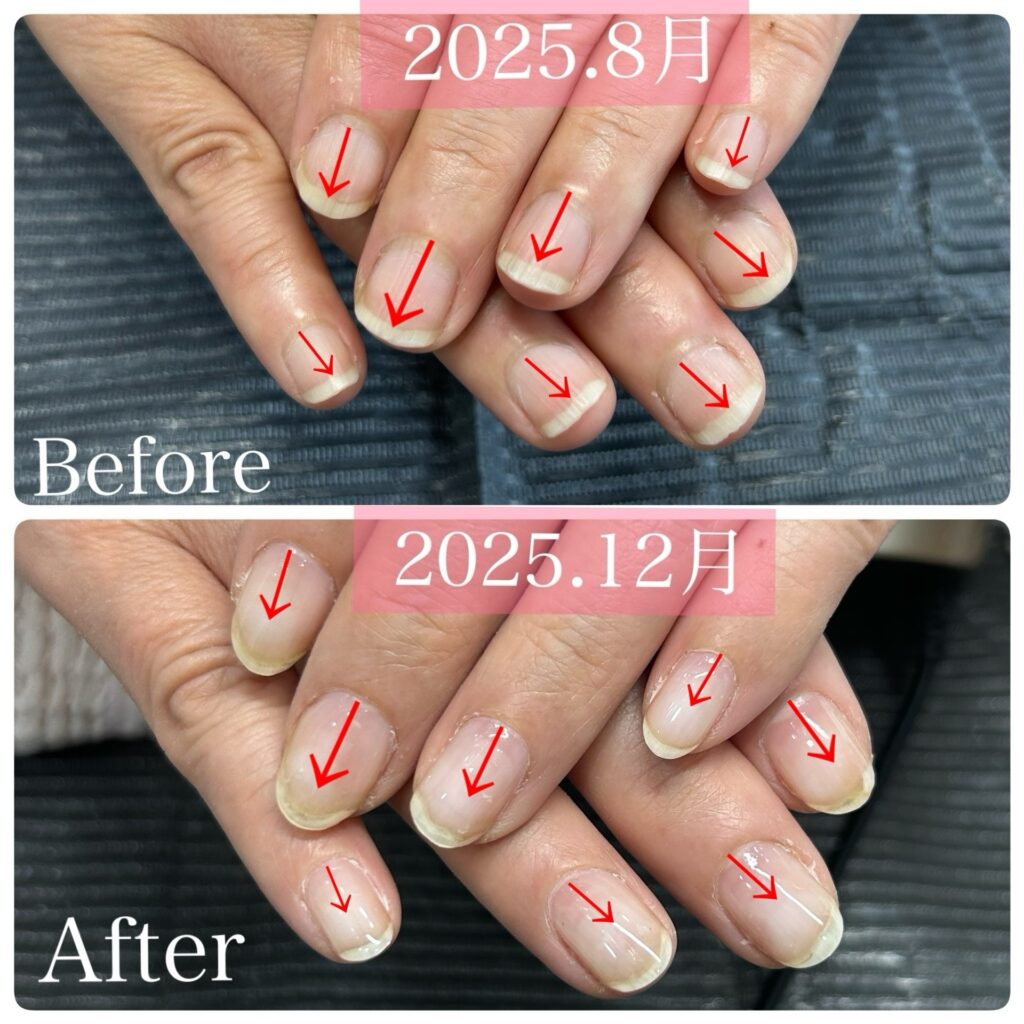 最初はお爪のピンクの部分が小さく横に広がっていたのですが、ジェルを続けてくださって早5ヶ月、こーんなに縦長になりました‼️